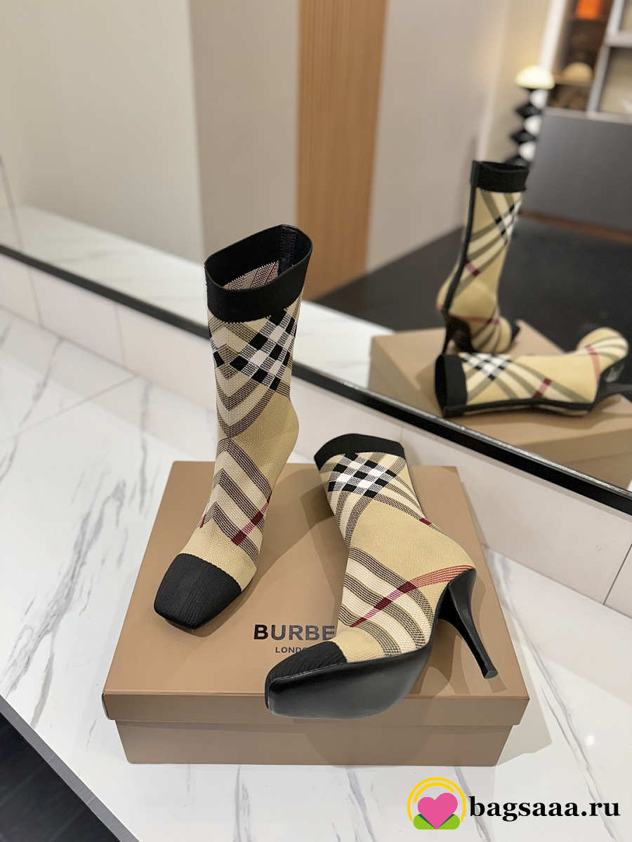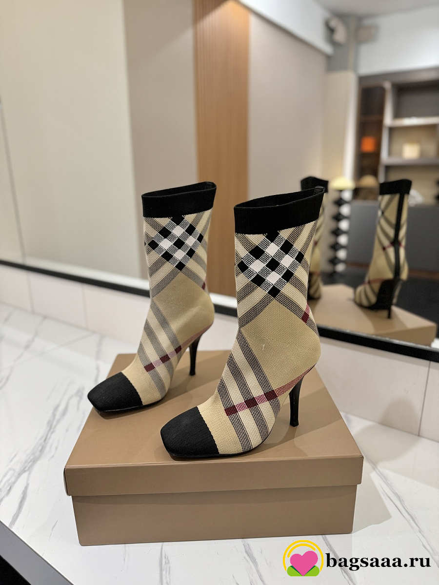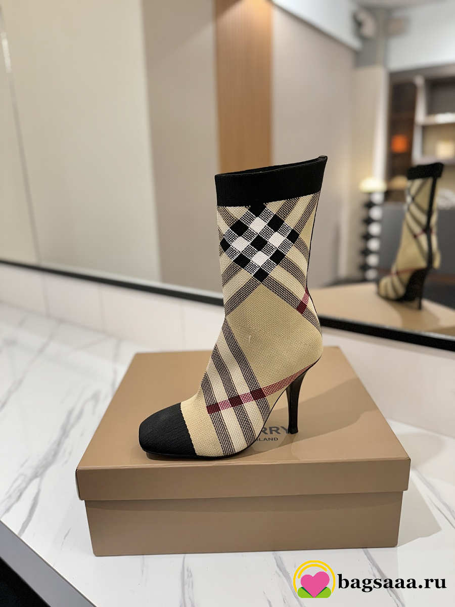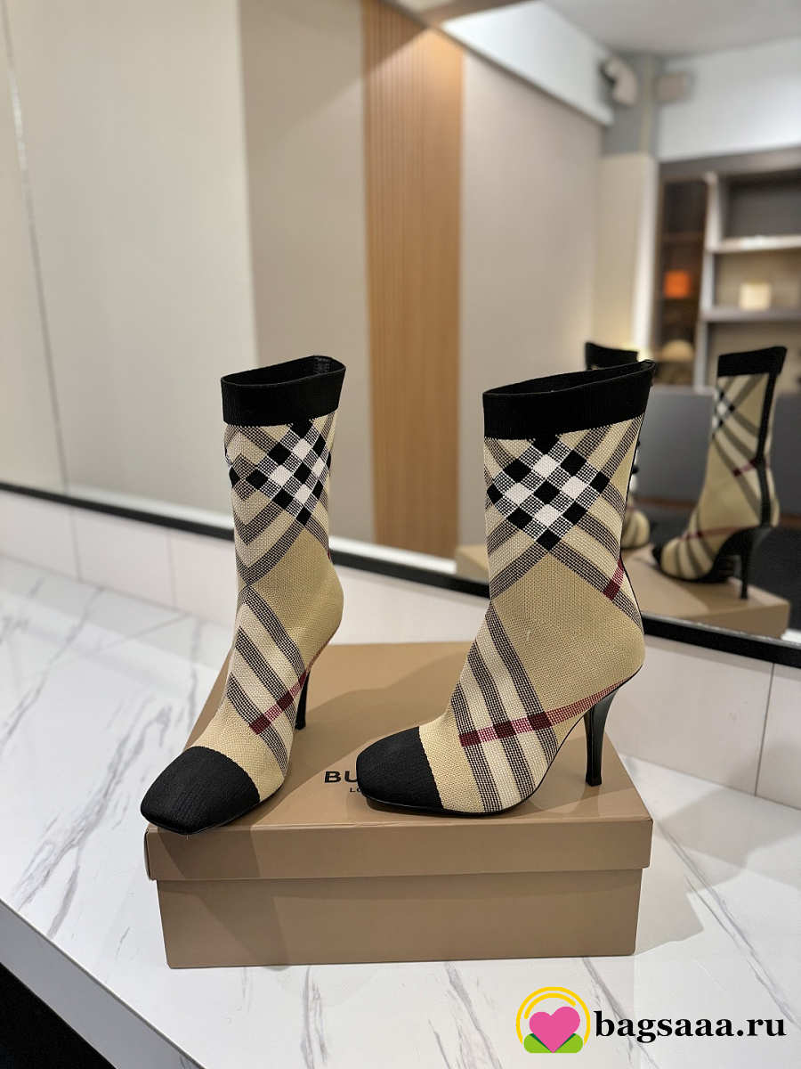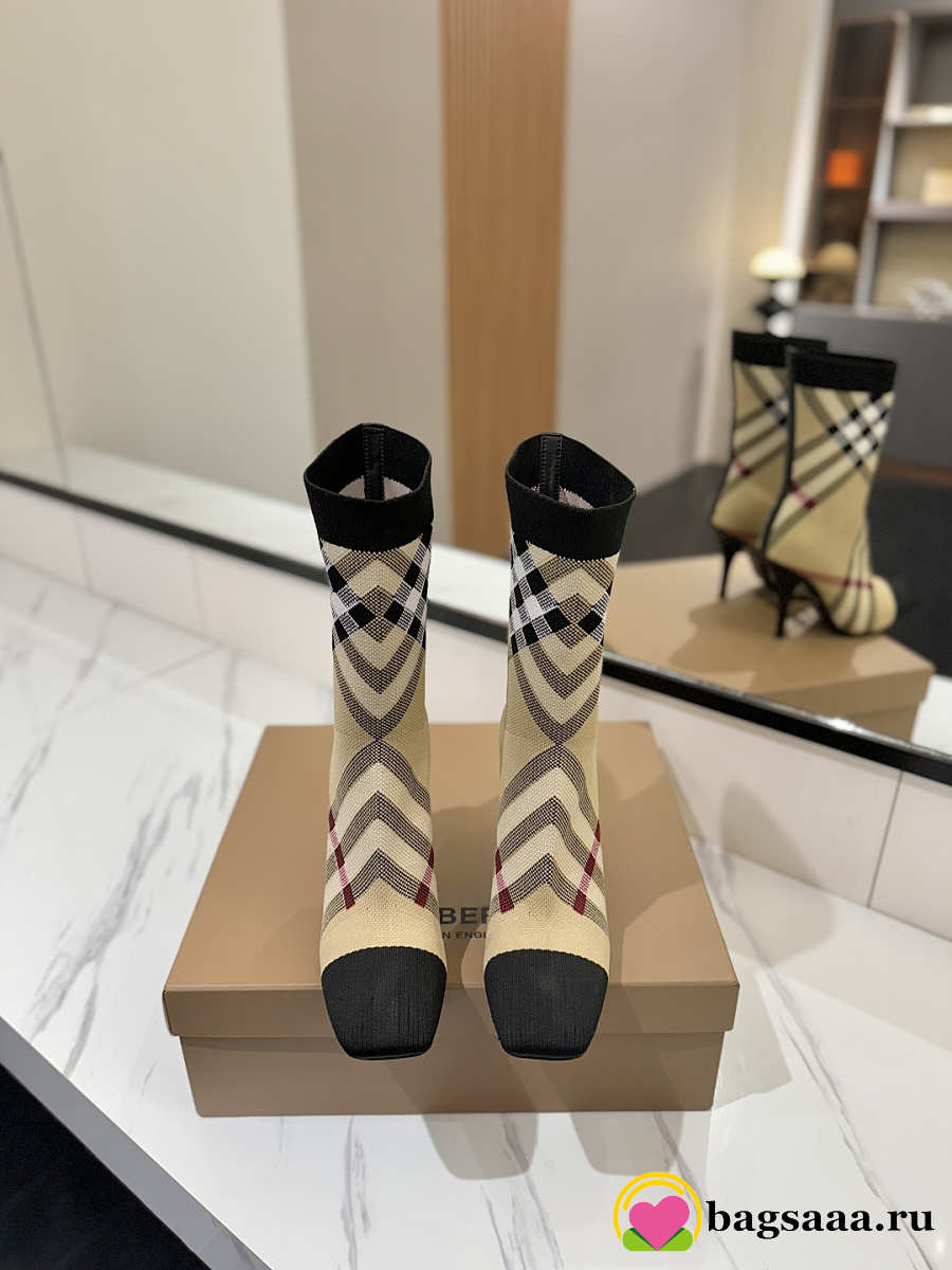 Bagsaaa Burberry check-pattern knit sock ankle boots beige
