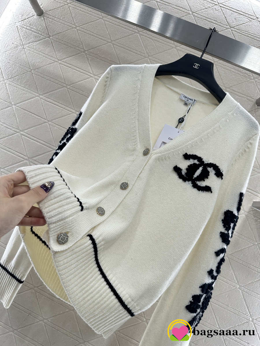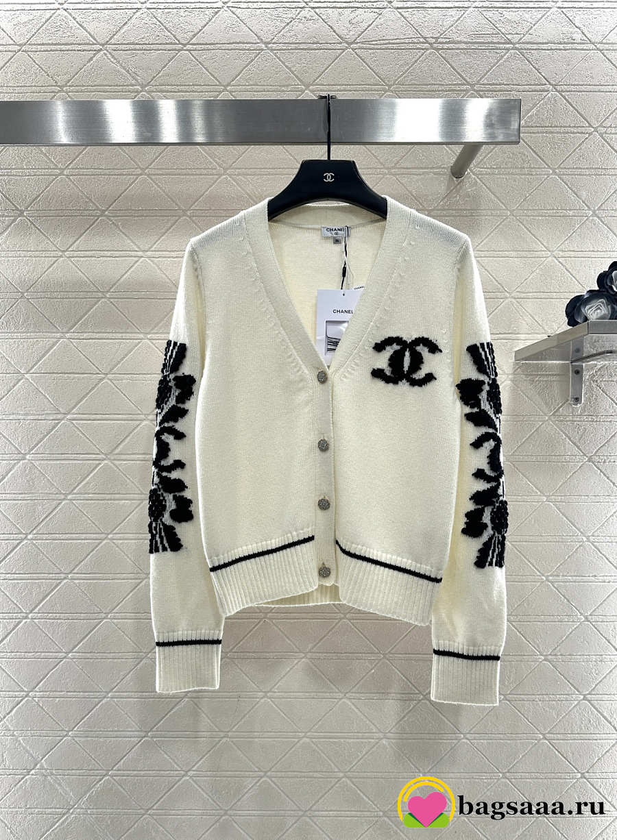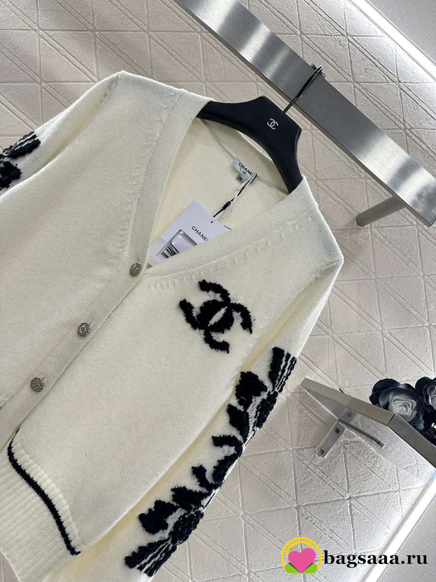 Bagsaaa Chanel cardigan in white with black floral appliqués