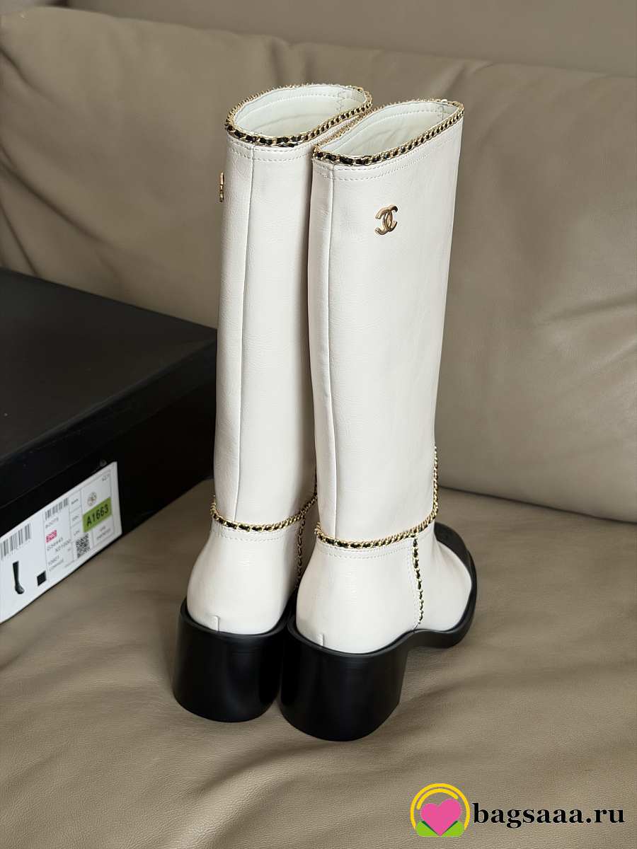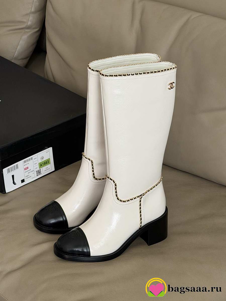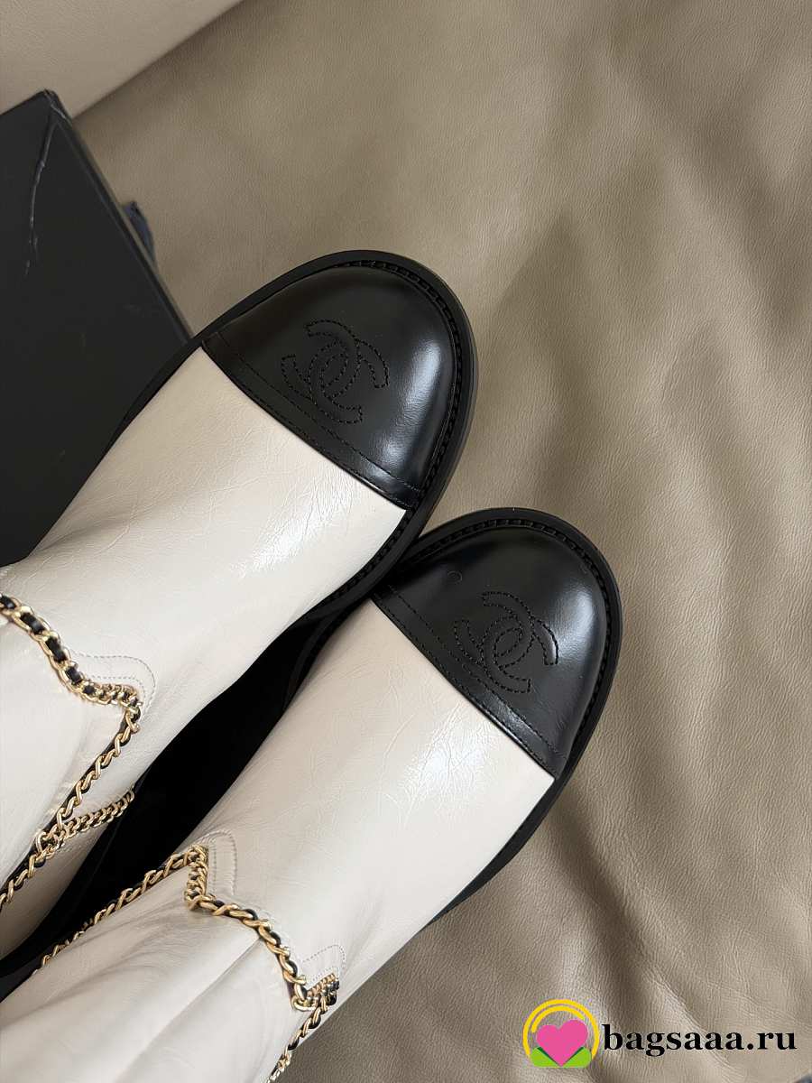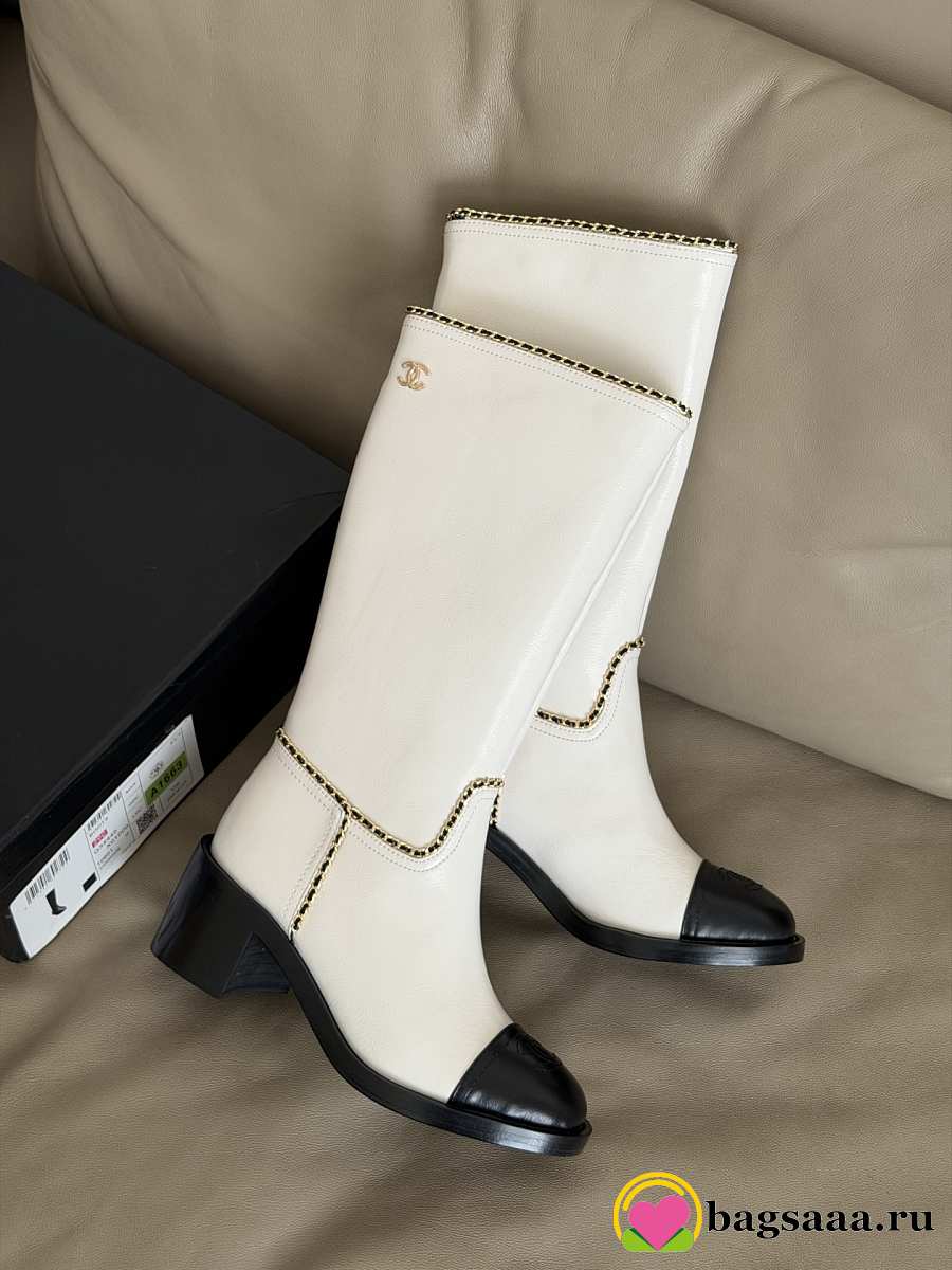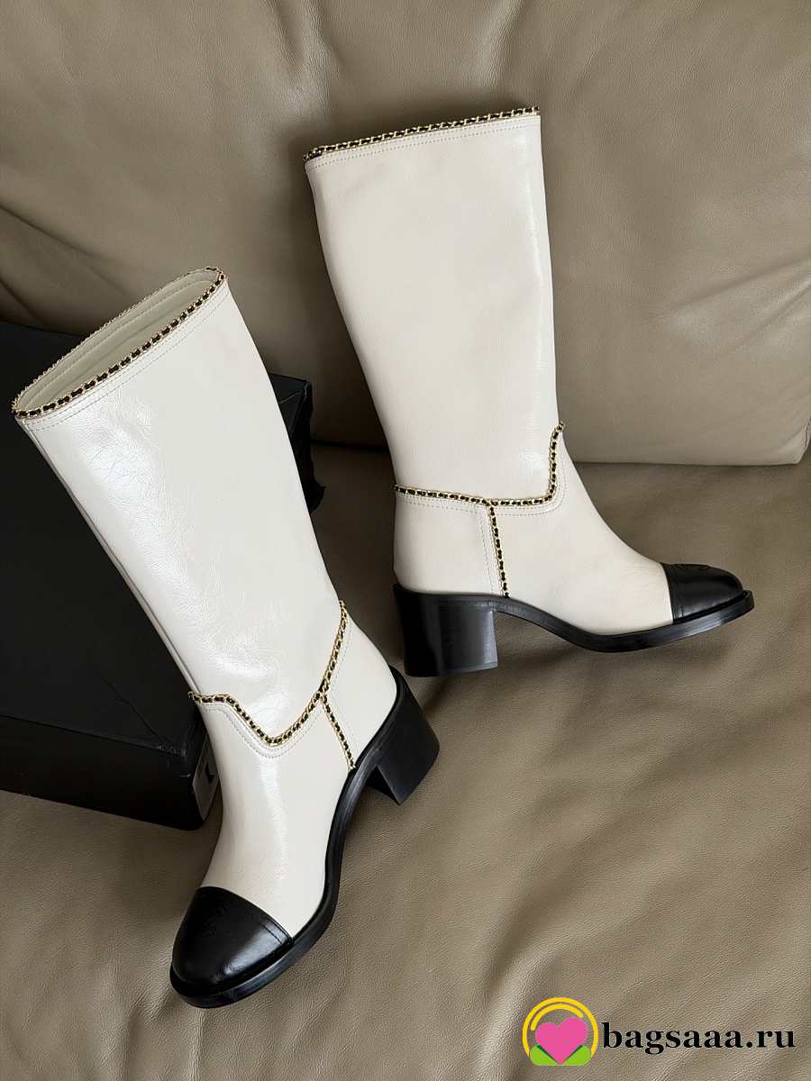 Bagsaaa Chanel mid-calf boots in white patent leather with black cap toes