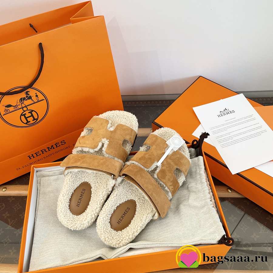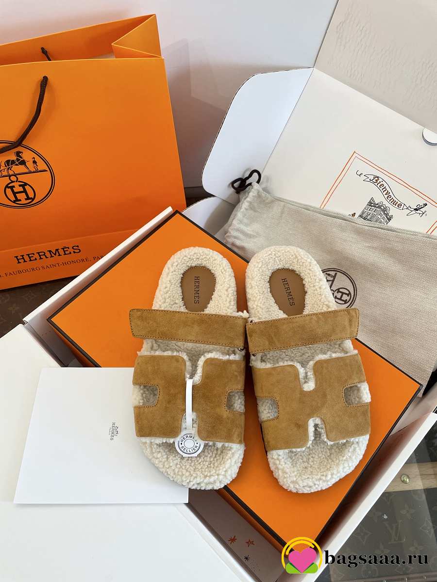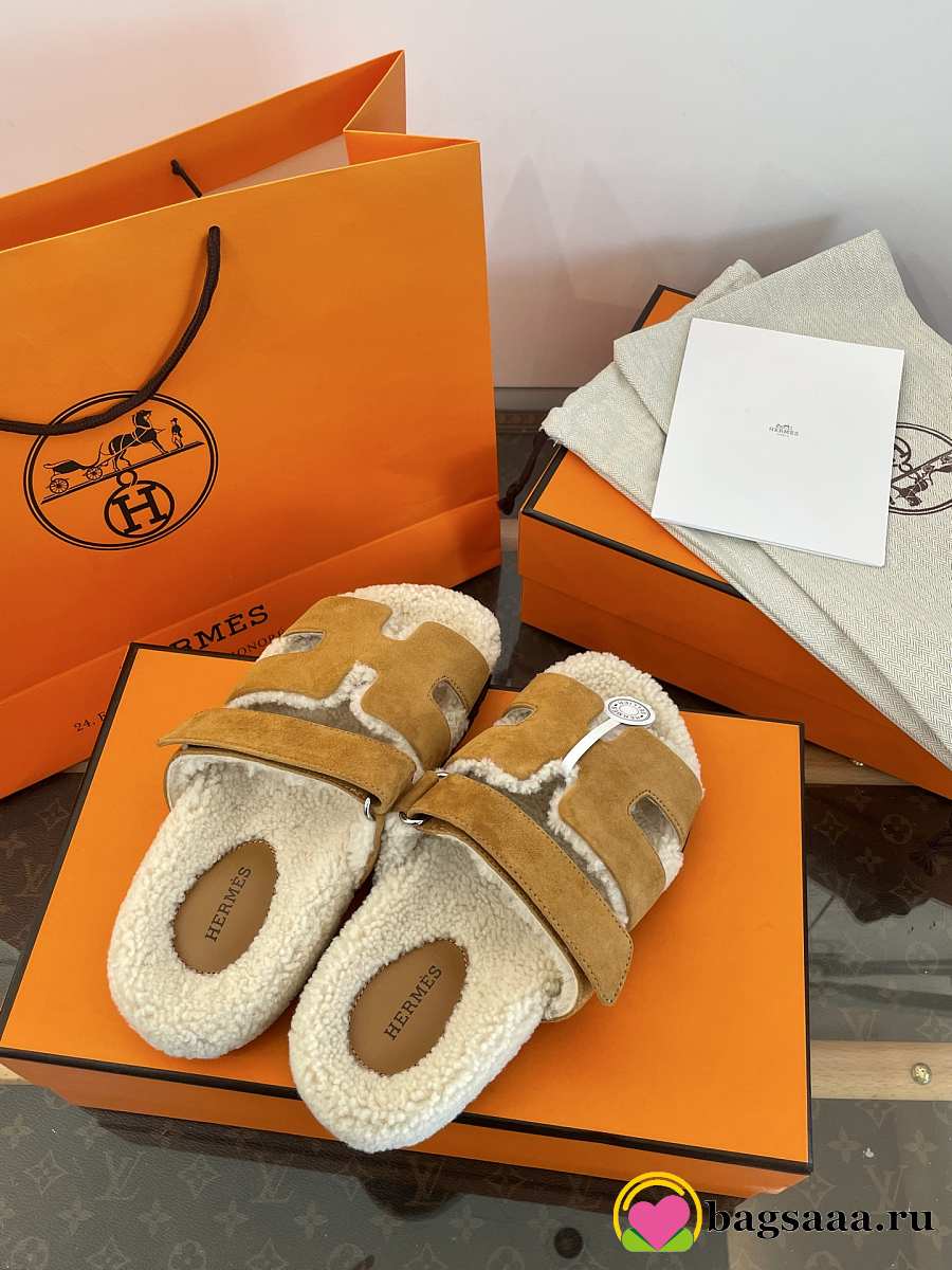 Bagsaaa Hermes Chypre sandal brown & shearling