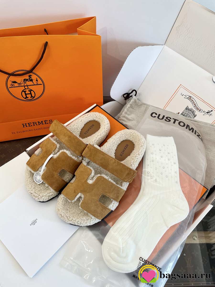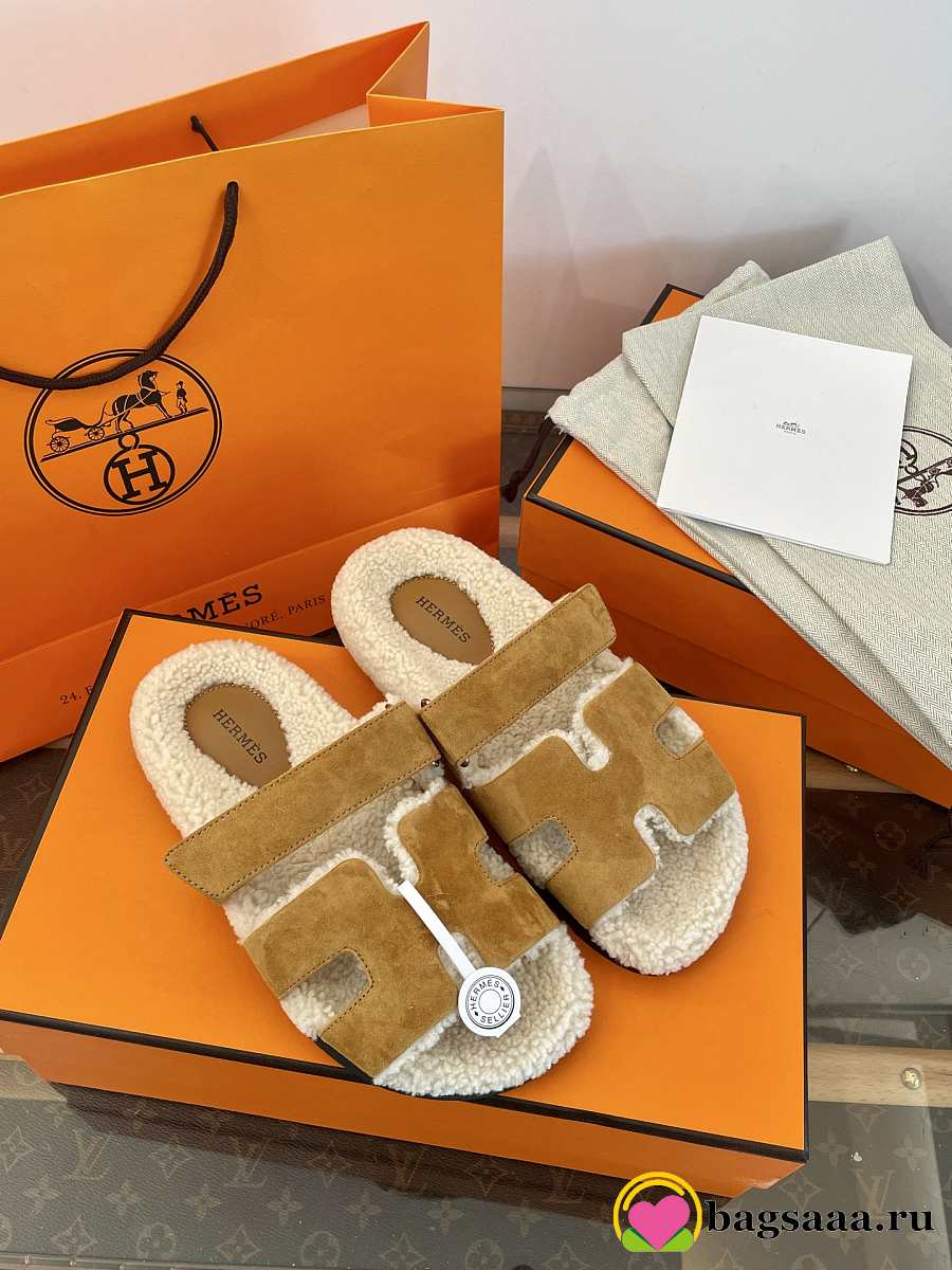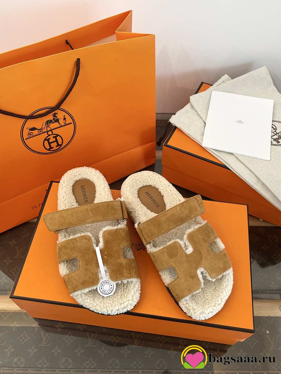 Bagsaaa Hermes Chypre sandal brown & shearling