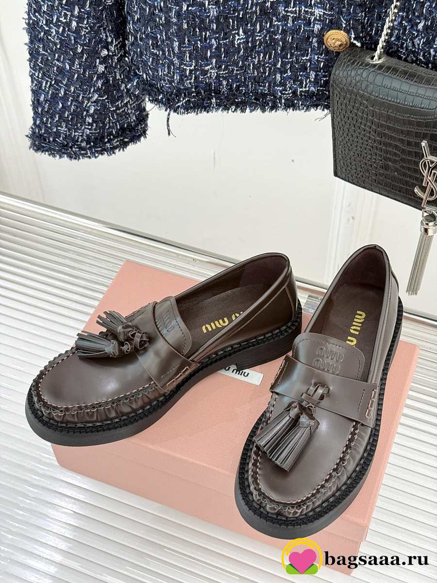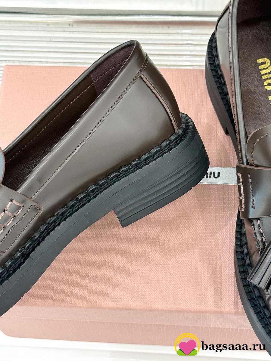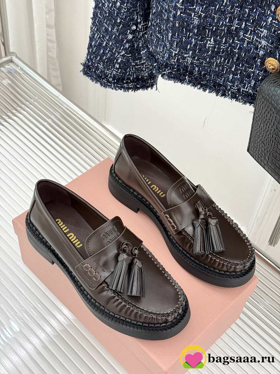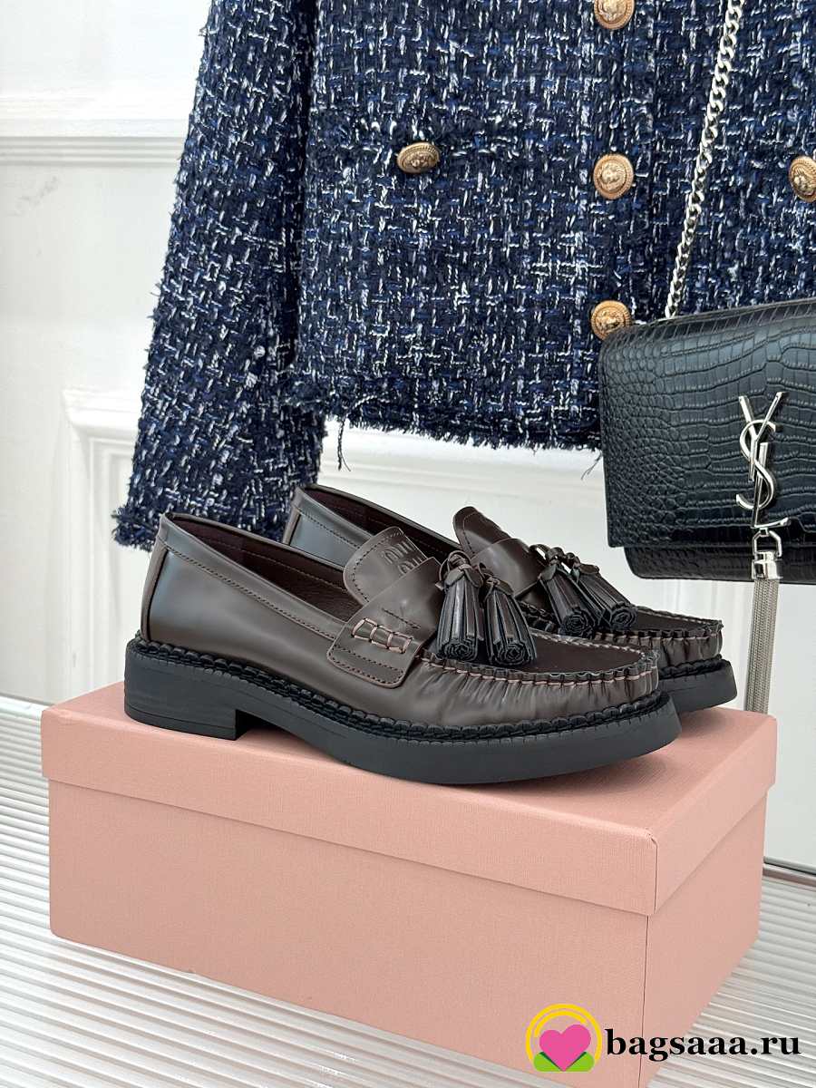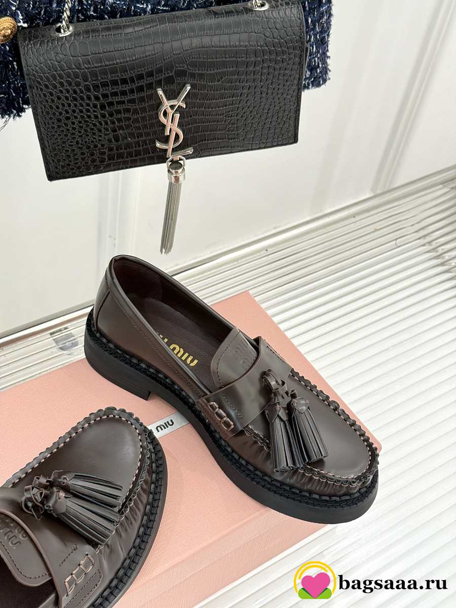 Bagsaaa Miu Miu polished leather tassel loafers in dark brown