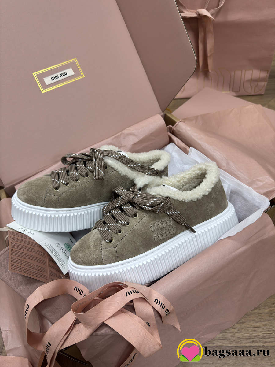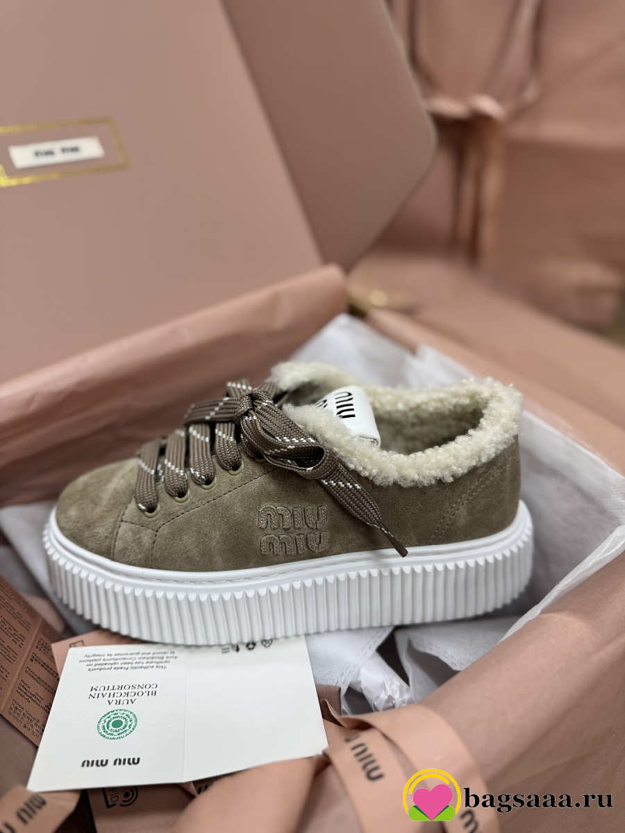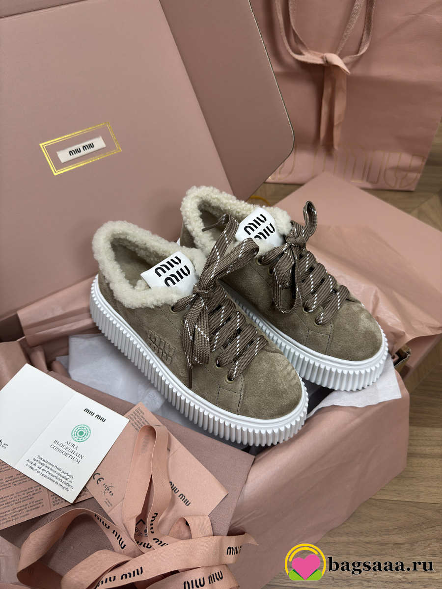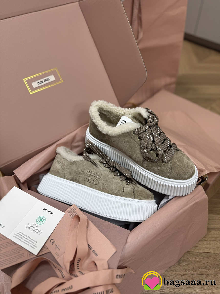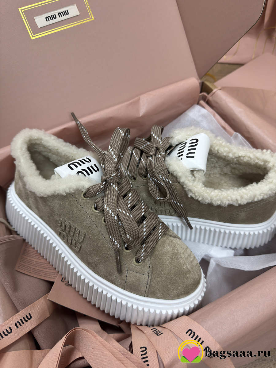 Bagsaaa Miu Miu suede and shearling sneakers beige