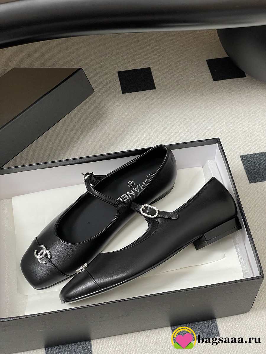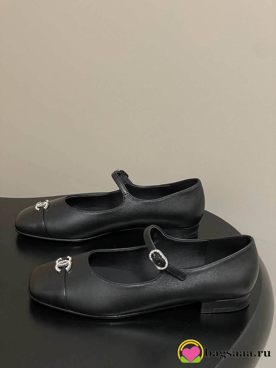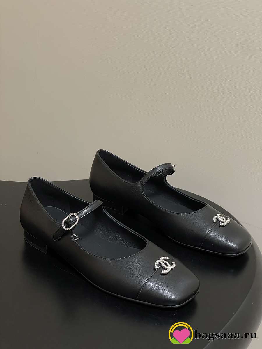 Bagsaaa Chanel black leather Mary Jane flats with crystal-embellished CC
