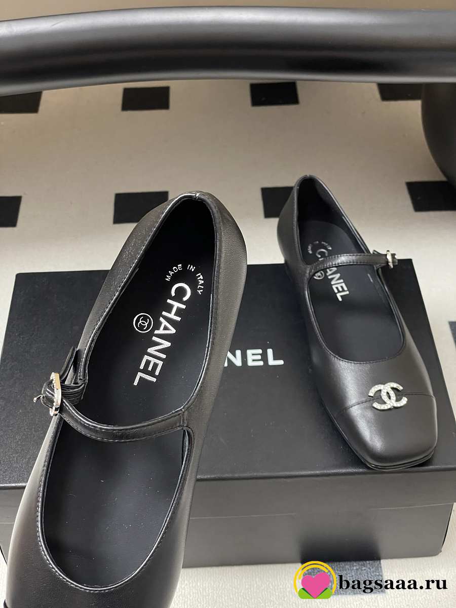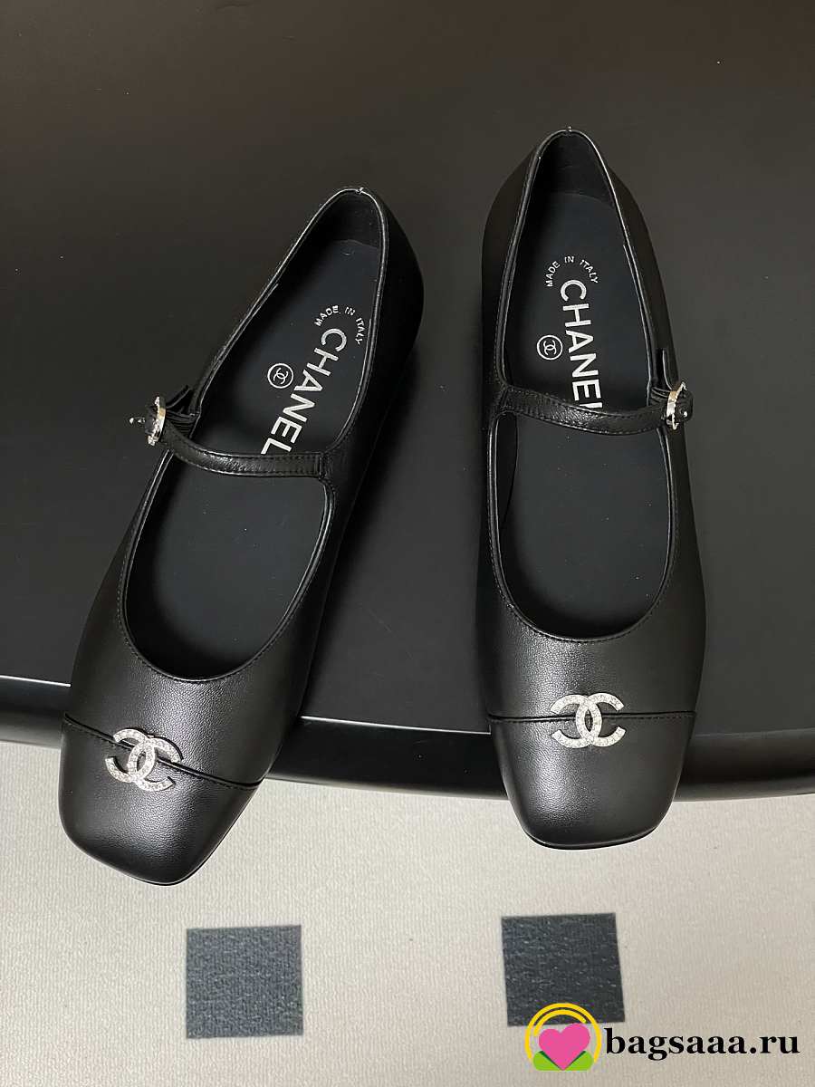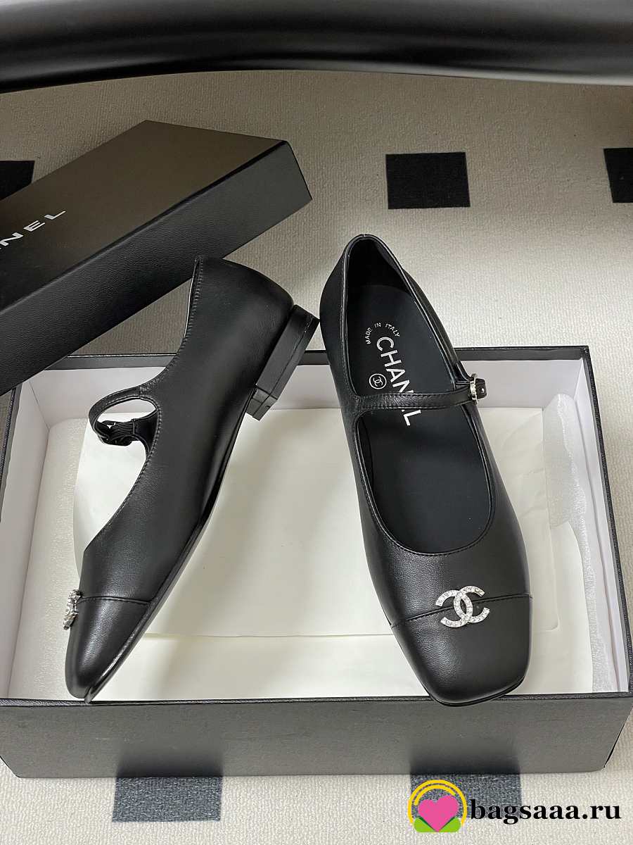 Bagsaaa Chanel black leather Mary Jane flats with crystal-embellished CC