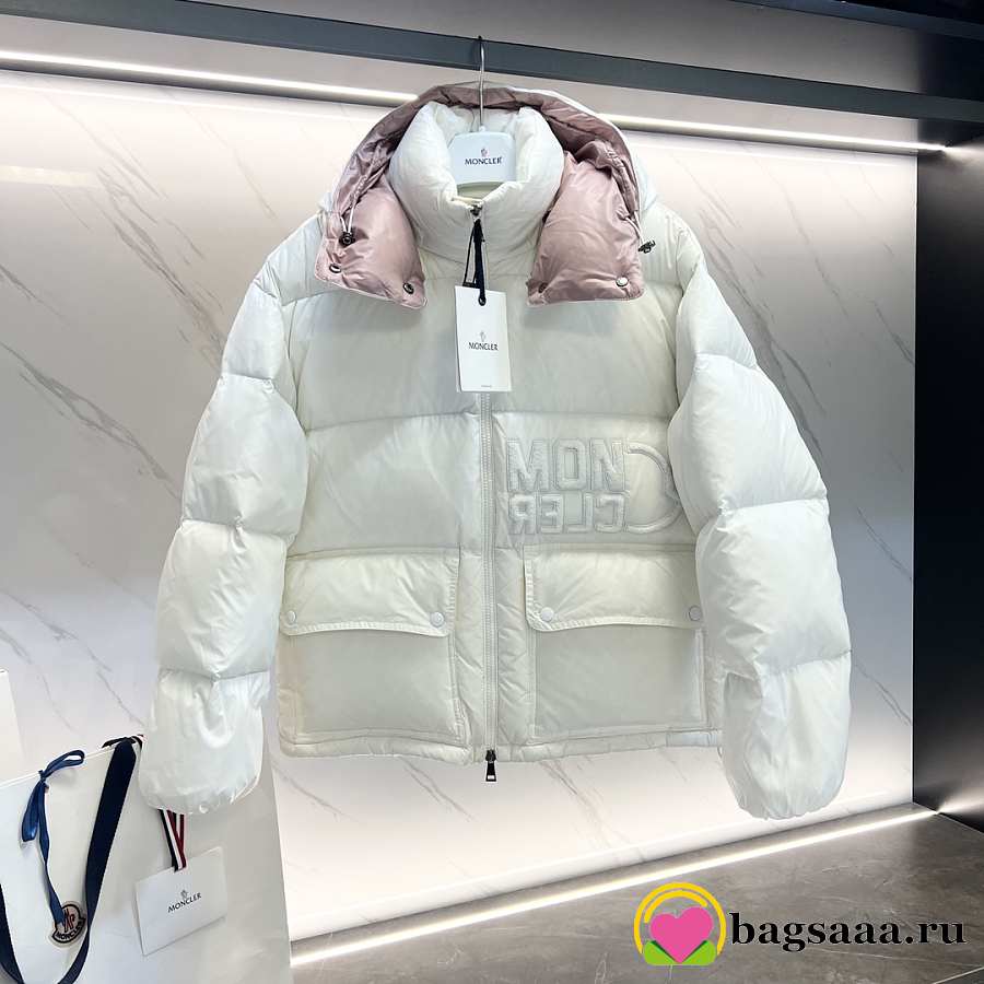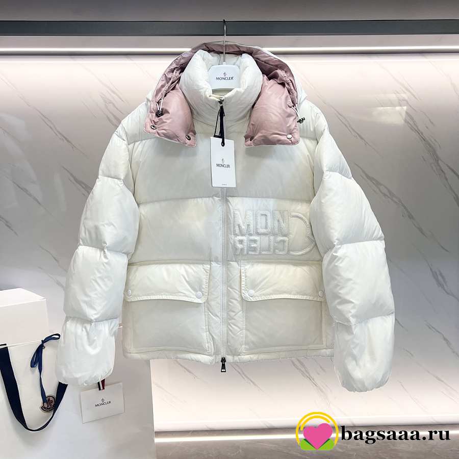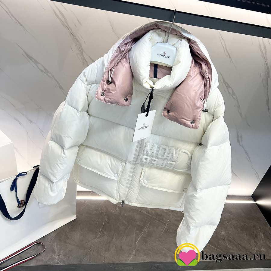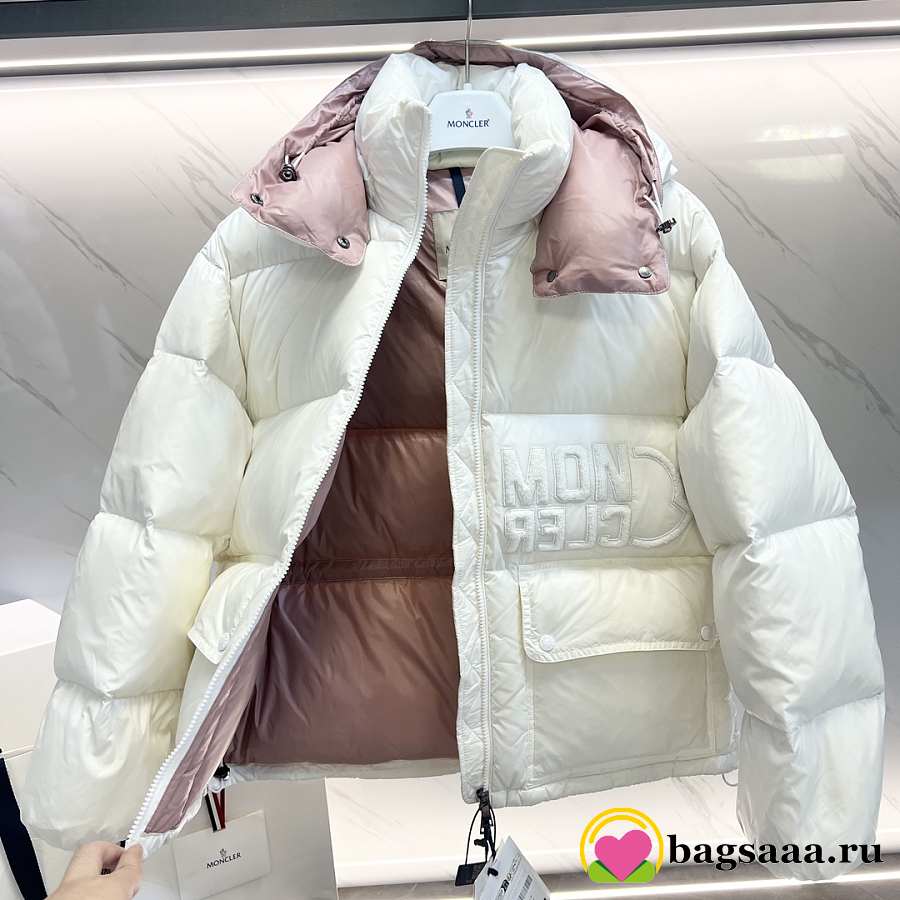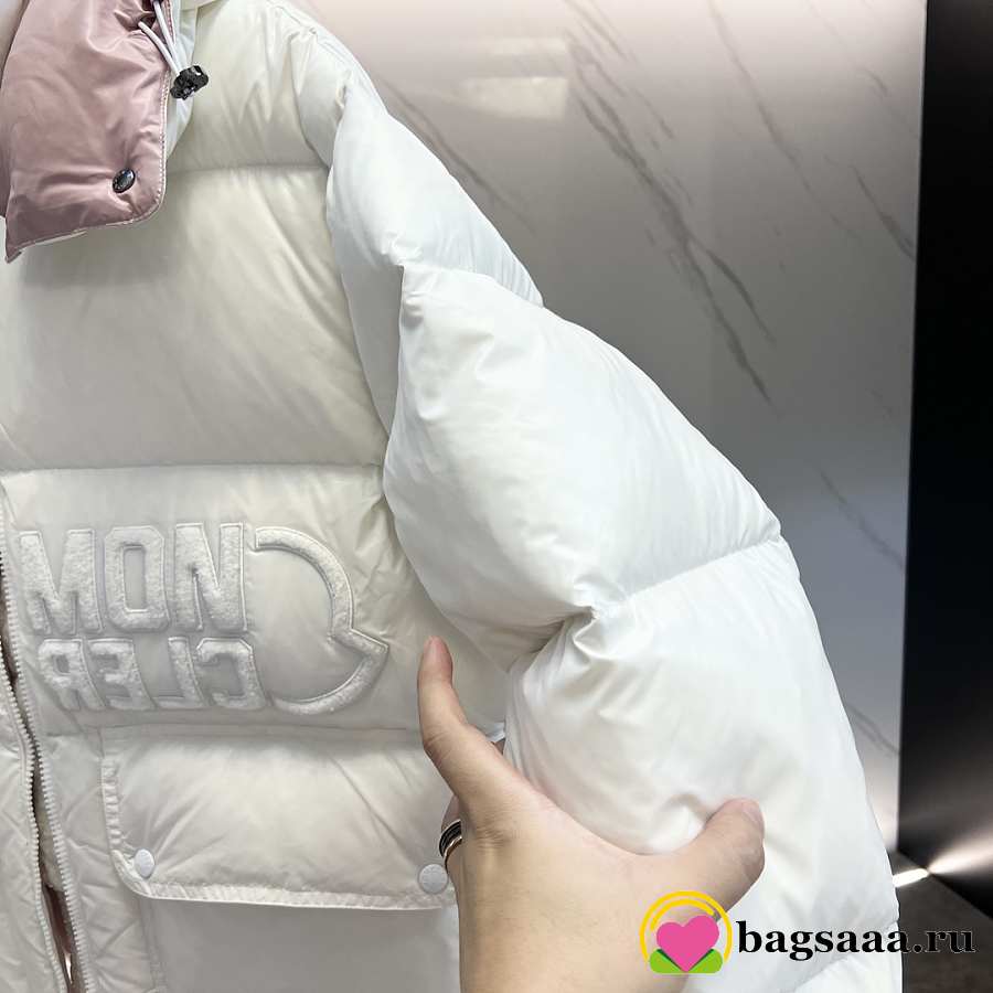 Bagsaaa white Moncler puffer jacket with a light pink hood lining